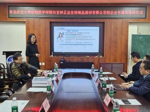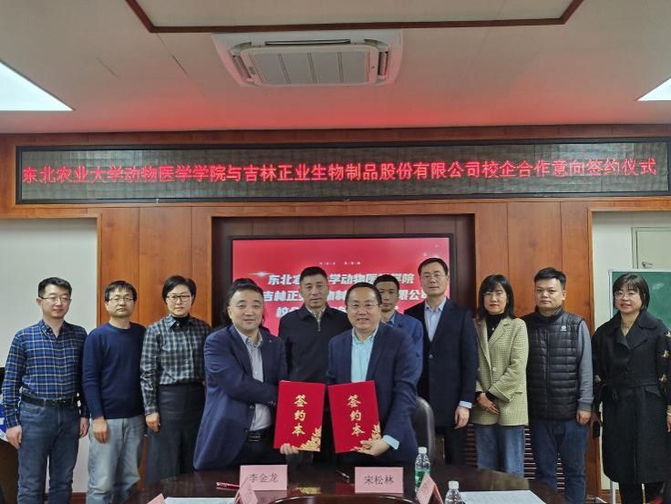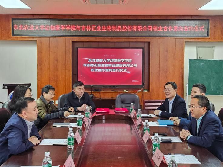 吉林正业生物制品股份有限公司董事、总经理宋松林、研发总监边少国、技术与市场总监王红岩、技术与市场部经理孟相秋、人力行政部经理肖阳,太阳成集团tyc41183院长李金龙、副书记赵文和、预防兽医学教授唐丽杰、乔薪瑗、葛俊伟、张文龙出席了会议。签约仪式由李金龙主持。