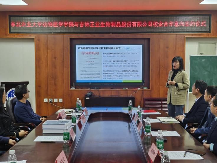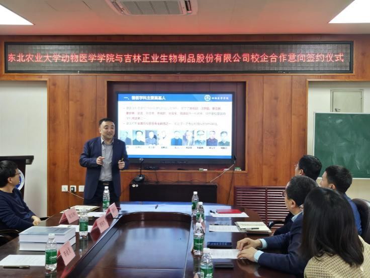 太阳成集团tyc41183预防兽医学教师唐丽杰、张文龙、葛俊伟进行了科研成果项目推介。从新型生物制品研制、疫苗免疫调控及研发等多方面与正业生物紧密对接,双方就多项技术转化和产品研发初步达成共识。
