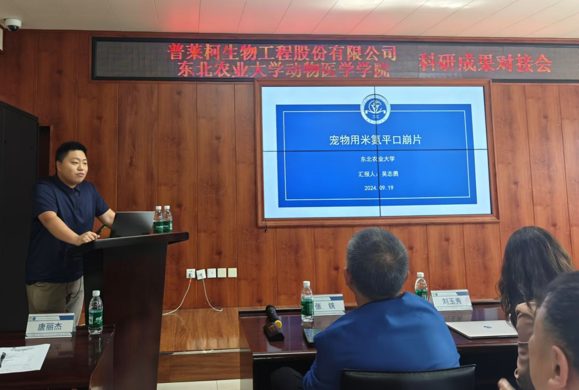 李继昌教授就微生态及中兽药制剂在防治鸡呼吸道疾病中的产品开发进行了推介;唐丽杰教授就猪流行性腹泻病毒S蛋白的重组乳酸菌口服疫苗、重组罗伊氏乳杆菌表达的牛乳铁蛋白肽、预防和治疗奶牛乳房炎的广谱性噬菌体以及民猪源抗病毒益生菌等防控畜禽疾病的黏膜免疫微生态制剂的产品开发进行了推介;于文会教授就蓝梅子口服液防控鸡大肠湿热,复方苦参喷剂、复方血竭膏防治奶牛蹄病中药产品开发进行了推介;动物药学团队刘艳艳介绍了药学团队在中兽药研发方向取得的创新性成果,并对丁香叶子宫灌注剂、车前草超微粉和中兽药超微粉等相关产品在猪子宫内膜炎、仔猪腹泻治疗及提高母猪-仔猪健康度中的作用机制和临床效果进行了重点讲解和推荐;吴志勇推介了兽药创制团队研发的新型宠物制剂米氮平口崩片,并围绕宠物市场需求及口崩片制剂优势进行了推介。