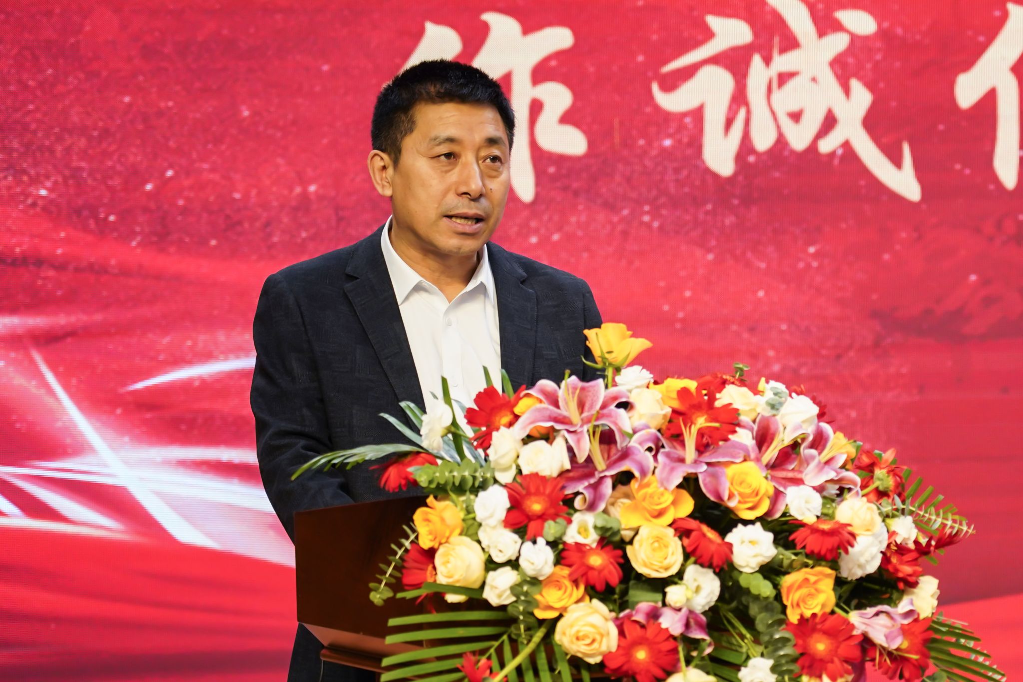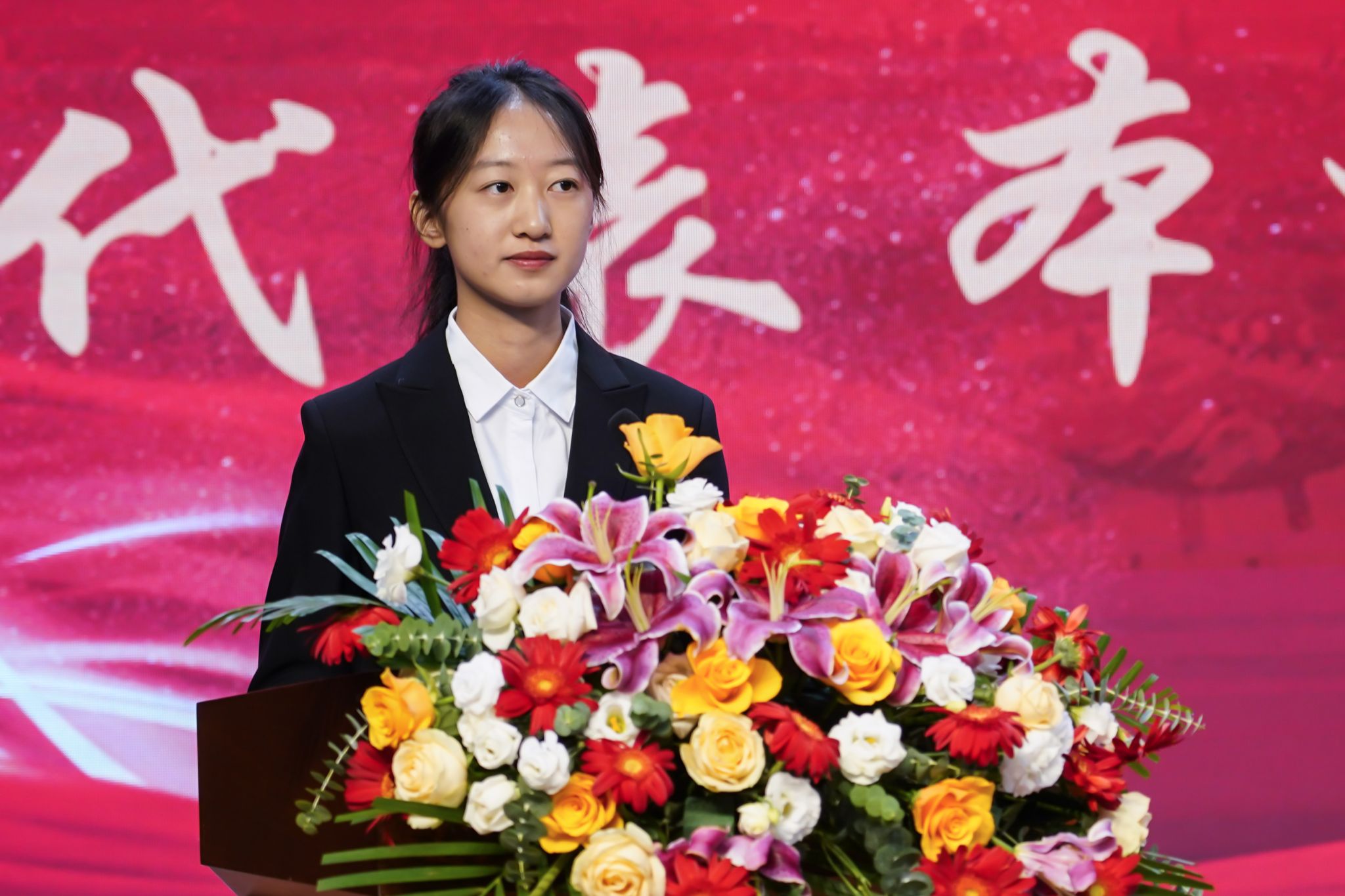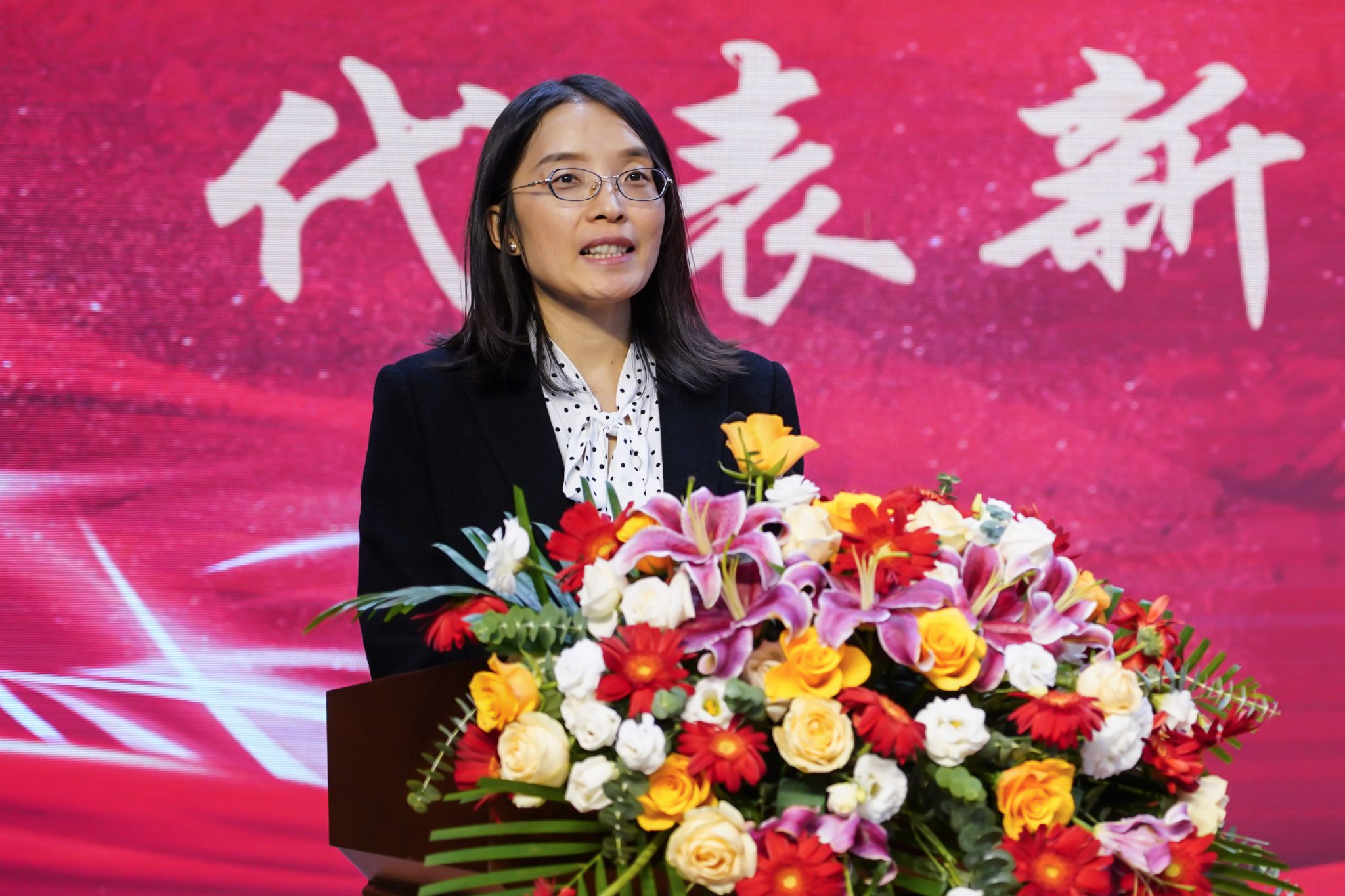 动医2481班班主任王丽代表新生班主任发言。她希望刚迈入大学的新生在兴奋激动的同时能思考未来、坚持学习、学会自律、融入集体,并祝福同学们在大学岁月中,在知识积累中追逐梦想、实现价值。