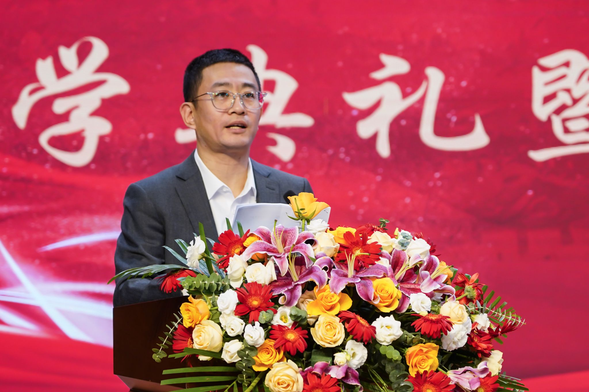 博动医2401班李博同学代表研究生新生发言。他回顾了自己与东农八年来的深情羁绊,分享了自己在奋斗道路上的成长与历练,呼吁同学们在追求卓越的道路上奋斗不息,勇担国家使命,共创东农荣誉!
