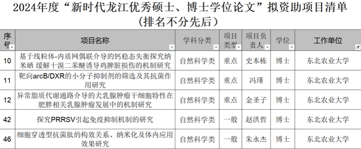 近日,黑龙江省教育厅公示了2024年度“新时代龙江优秀硕士、博士学位论文”拟资助项目清单,其中包括重点项目29项,一般项目71项。太阳成集团tyc411835人获批项目资助,教师史本栋、冯瑾和博士后金圣子获批自然科学类重点项目资助,教师赵洪哲和博士后朱永杰获批自然科学类一般项目资助。我院在资助项目兽医学科领域的获批数量位列省属高校首位。