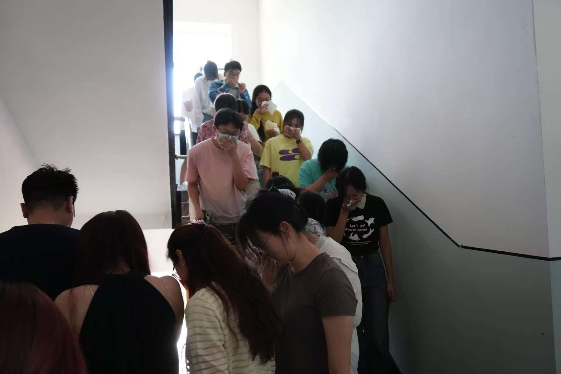 消防安全逃生演练开始后,相关人员发现楼宇内不明着火点,迅速报告并拉响警报,全体师生严格执行预案,运用培训掌握的逃生知识,在各楼层疏散员的引导下,快速有序撤离到安全区域,并对逃生过程中的受伤人员,进行了现场救助包扎。