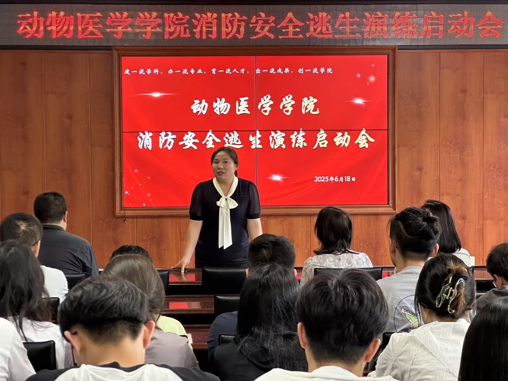学院党委书记张春燕在消防安全逃生演练启动会上进行演练前动员,她指出安全是学院一切工作的底线和基石,消防安全更是重中之重,一旦发生火灾,后果不堪设想。她强调师生不能有任何的侥幸心理,必须要防患于未然。同时,就做好本次消防演练工作,重点提出三点要求,一要守纪律,听指挥。疏散过程必须做到不推搡、不拥挤、不逆行,保持秩序,注意脚下安全,安全有序撤离;二要学真招,会实践。将学到的逃生知识和技能内化于心、外化于行,做到心中有数,遇险不慌。完全掌握安全逃生及消防技能;三要互相帮助,共同担当。演练绝非完成任务、走过场,目的是让大家切实掌握逃生技巧,在危急时刻能临危不乱、自救互救,把生命安全摆在首位。