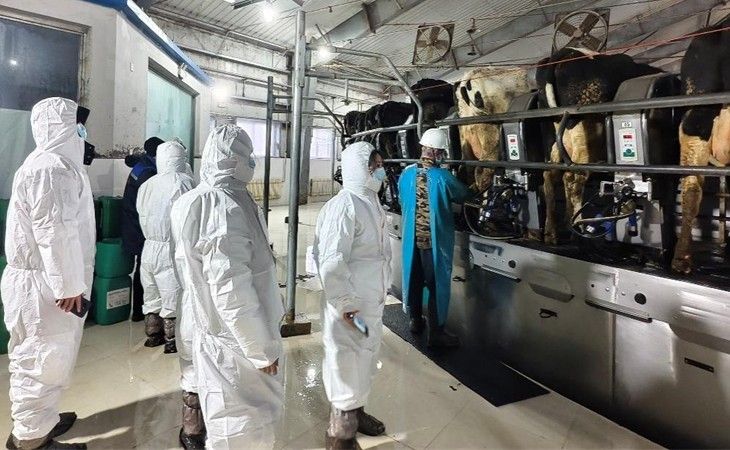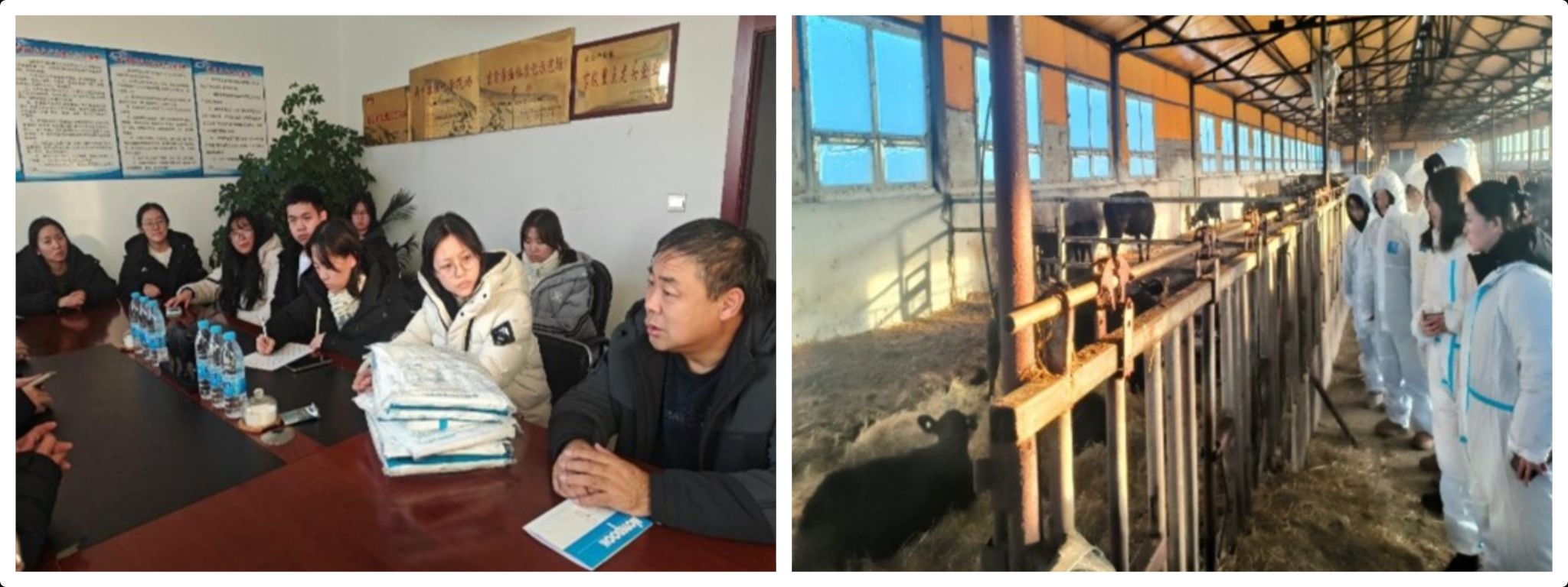 在密山市八五一一农场,与寒疆牧业、将军奶牛养殖专业合作社等骨干养殖主体开展座谈交流。团队系统了解了奶牛养殖在环境管理、疫苗接种和健康档案等方面的现有措施,并重点围绕奶牛乳房炎、消化道疾病等常见病的诊疗难点进行研讨。结合肠道菌群与消化类疾病关联机制的研究成果,实践团为早期诊断、精准用药和健康调控提供了专业建议。随后,团队前往新福肉牛场进行实地调研。成员规范穿戴防护装备,深入牛舍、诊疗区等区域,通过临床观察与记录核查,就肉牛常见病早期筛查与肠道健康维护等问题与场方交流意见。