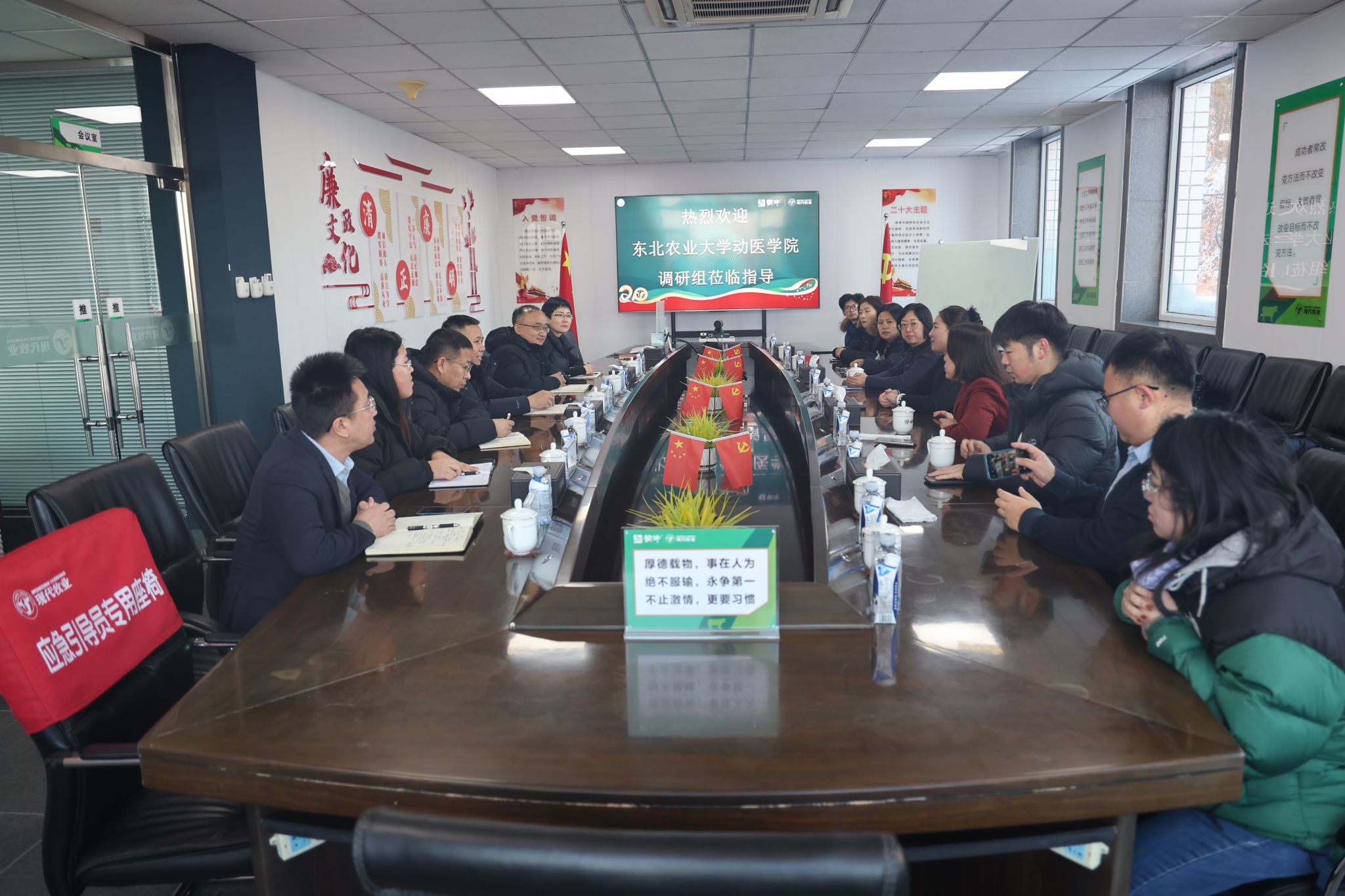 在现代牧业(尚志)有限公司,学院一行与现代牧业总经理包胜、生产经理张孝鹏、技术经理何西勇、人力行政经理陈杰、犊牛处高级主管史秀艳座谈交流。包胜对学校长期以来对企业的支持表示感谢,介绍了公司在事业发展、人才引进、合作需求等方面的情况。张春燕从学科建设、人才队伍、就业招聘、技术服务等方面介绍了学院相关情况。张鑫琳对企业长期以来对学院毕业生的认可和吸纳表示感谢,未来希望双方在实习基地建设、人才定制化培养等方面进一步深化合作,更好对接企业实际需求,共同培育行业所需高素质专业人才。双方共同观看了学院与企业宣传片,以及牧场牛舍和生产车间的实时录像,直观感受现代化奶牛养殖的高效管理与科技含量。