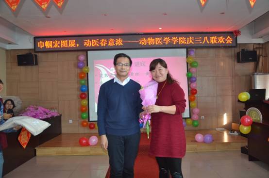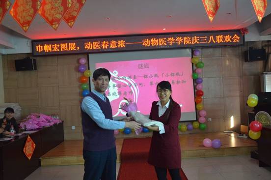 李一经院长猜谜后为女教工献花祝福