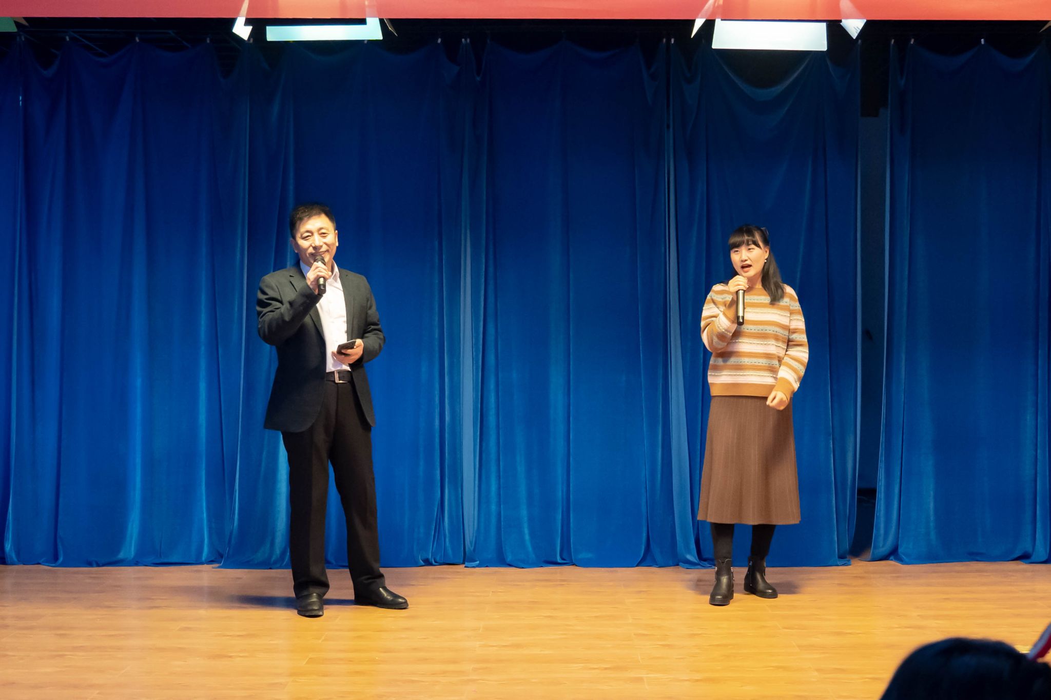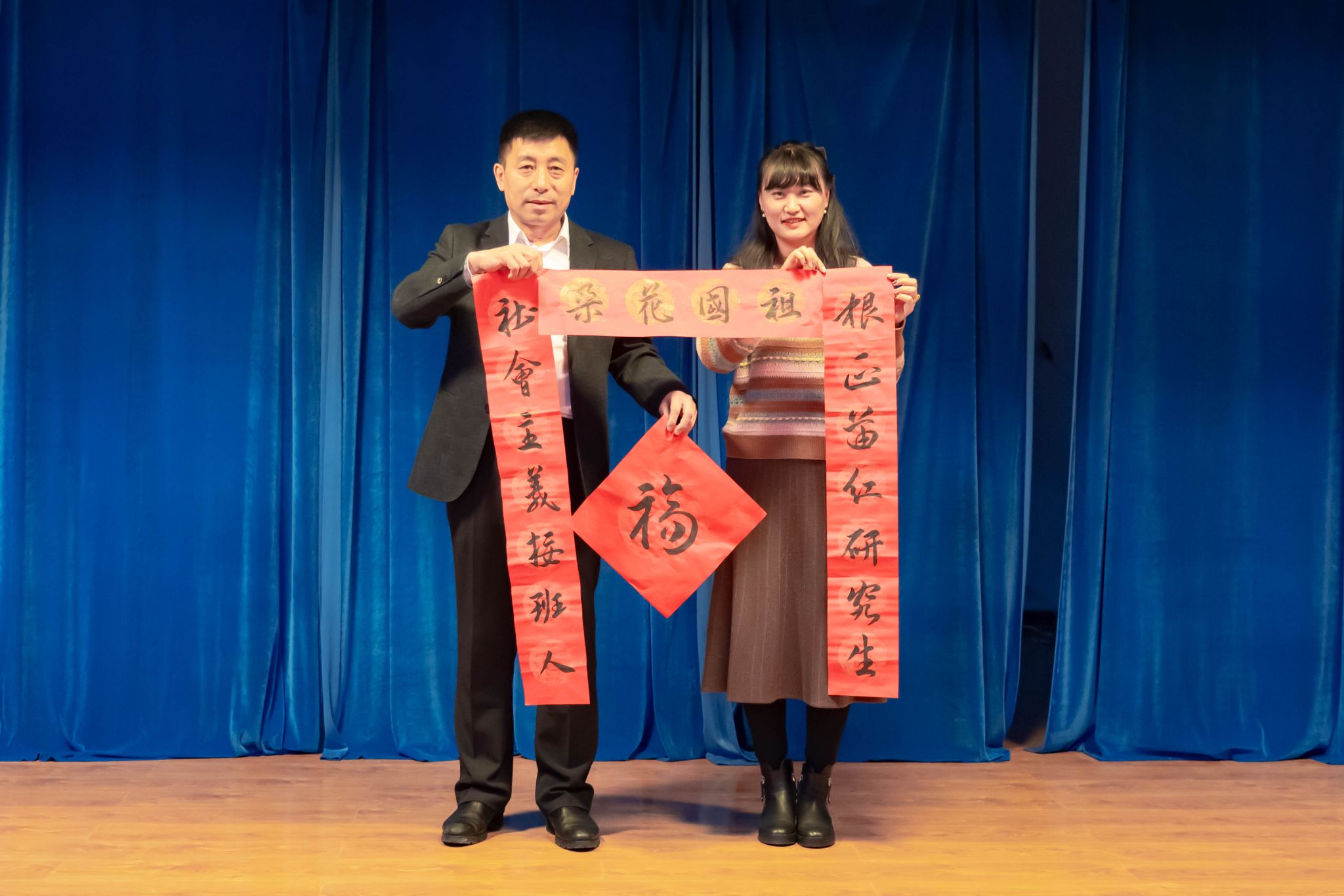 茶话会为全体教职工精心准备了春联作为新春礼物,学院党委副书记赵文和将第一幅春联赠送给见义勇为挽救生命的宋淼老师,号召大家学习见义勇为精神,传递榜样正能量。随后应宋淼之邀赵文和与其共同表演歌曲《红尘情歌》。