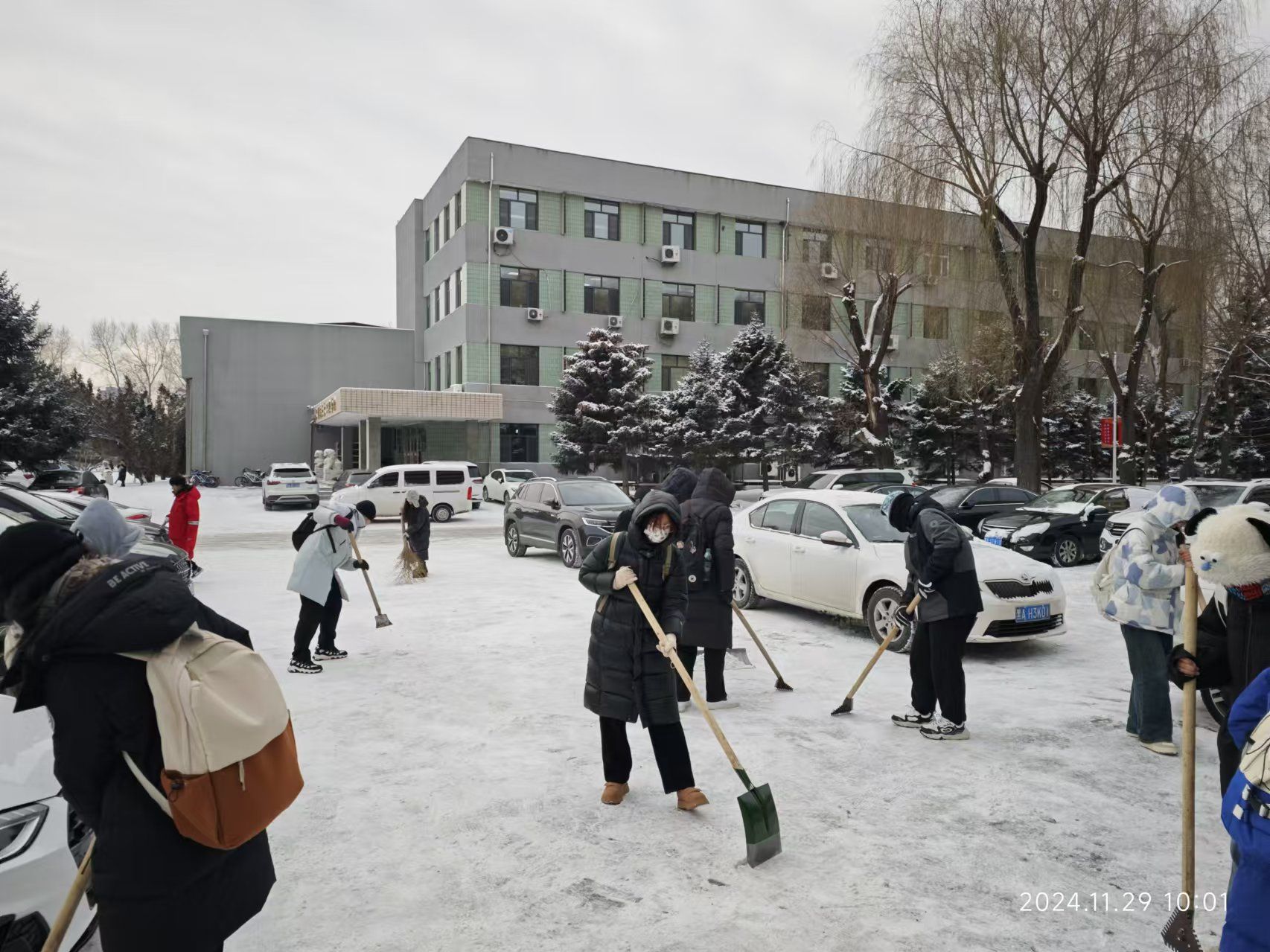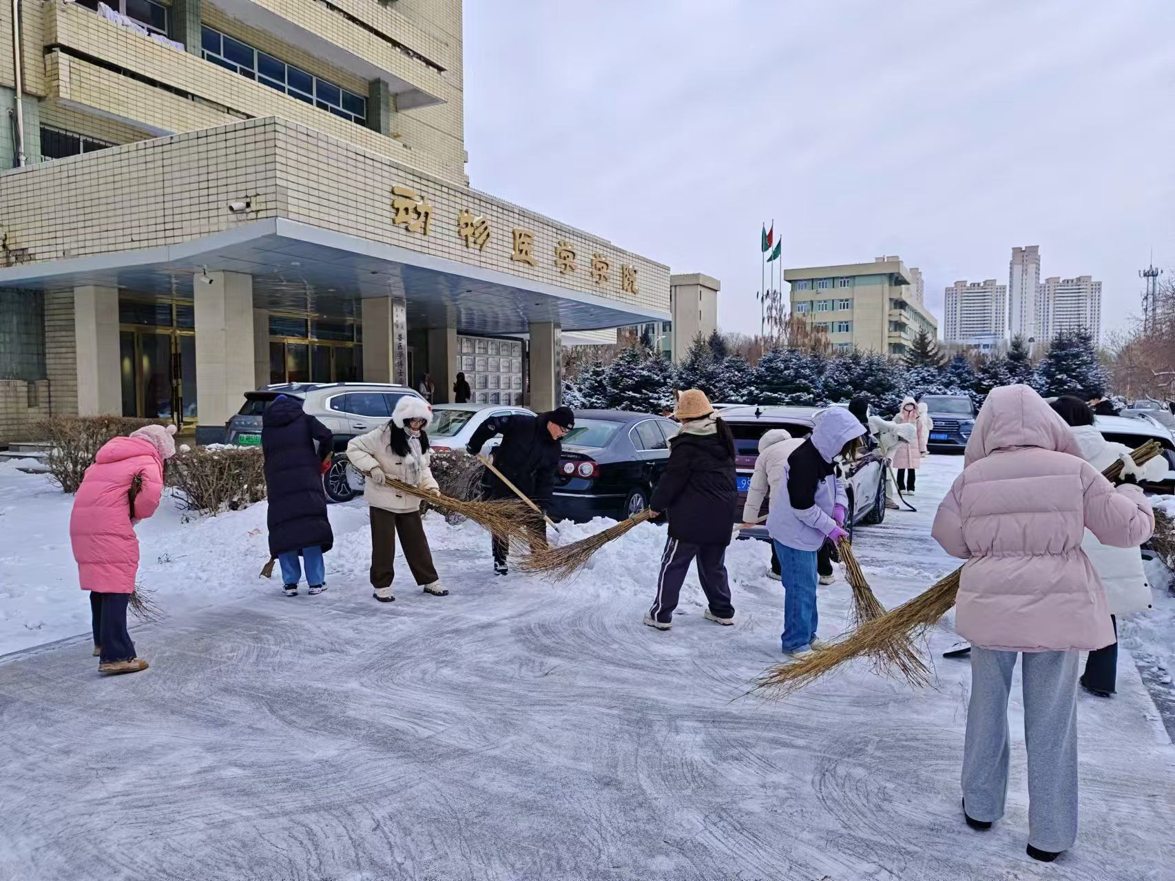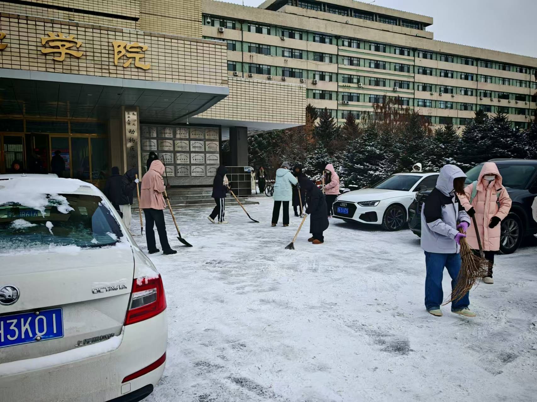 白雪纷扬落,拂晓祥光满。11月29日,动医学院师生自发组织扫雪活动,大家齐心协力,分工明确,手持工具清扫道路积雪。经过数小时奋战,牧医楼周围主要道路的积雪被清理干净,为师生们开辟出了一条条“安全通道”。
