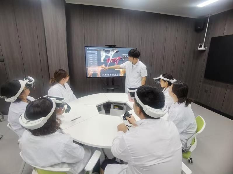 《兽医外科学》课程虚拟教研室建于2022,位于临床兽医楼222,共投入370万元。实体教学中心购置有牛皱胃左方变胃手术仿真实训教学系统、牛瘤胃切开手术仿真实训教学系统、猪脐疝手术仿真实训教学系统、术前准备仿真实训教学系统、犬膀胱切开与修补手术仿真实训教学系统、犬乳腺肿瘤手术仿真实训教学系统、犬胃切开手术仿真实训教学系统、犬股骨骨折内固定手术仿真实训教学系统、犬拔牙术仿真实训教学系统、犬肠管部分切除和断端吻合手术仿真实训教学系统、公犬去势手术仿真实训教学系统、犬眼科检查仿真实训系统、牛(马)跛行诊断仿真实训教学系统、牛(马)护蹄修蹄仿真实训教学系统等虚拟仿真教学软件等19套;购置VR、MR虚拟仿真教学设备19套,满足兽医外科学及兽医外科手术教学需求。云端中心建设有课程直播系统,满足虚拟教研室跨校同步课程、名师示范、教研交流的需求。