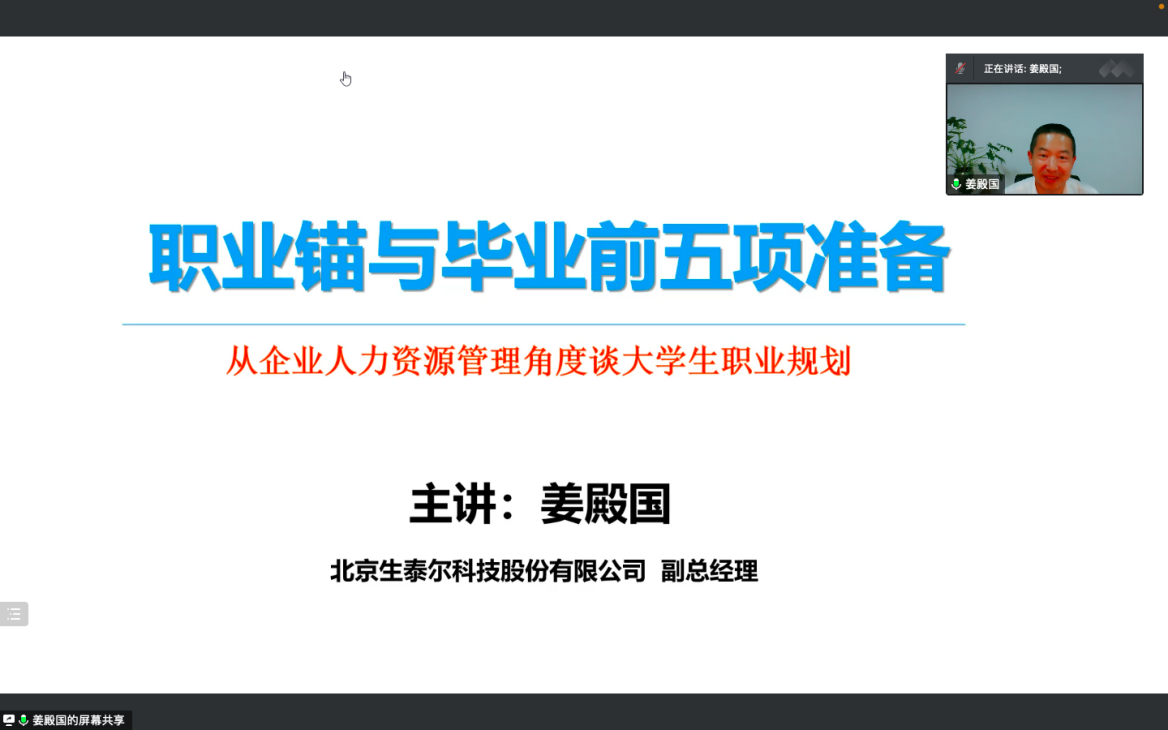 北京生泰尔科技股份有限公司副总经理姜殿国为同学们带来精彩报告。姜殿国从企业人力资源管理角度在求职面试突出问题、大学生职业规划策略、毕业前的五项准备三方面进行讲解,以资深的经验、丰富的阅历分享了他的职业生涯,建议同学们在大学期间要准确找到自己的职业锚,学好专业知识,毕业前要不断积累专业技能和实习经历。同时他对动医学子及线上模拟面试的效果进行了充分的肯定,对参与面试同学的简历和面试情况逐一进行了点评和建议。