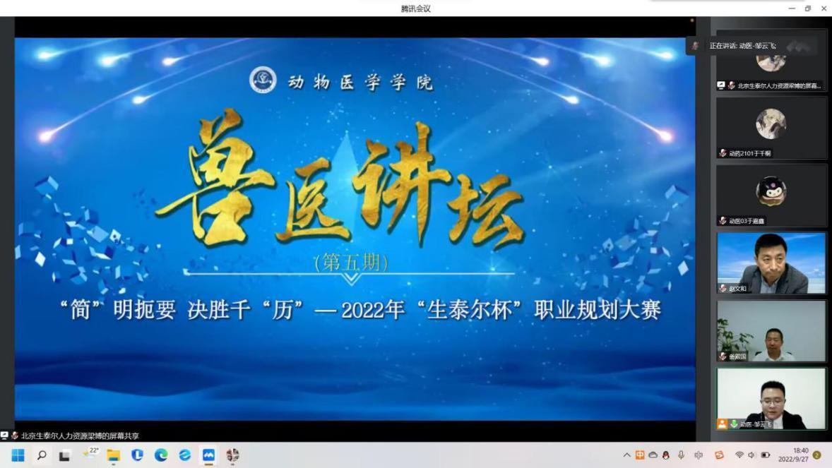 为提高人才培养与社会需求的契合度,促进校企合作交流,凝聚协同育人的各方力量,帮助学生树立正确的就业观职业观。9月27日,太阳成集团tyc41183联合北京生泰尔科技股份有限公司举办2022年“生泰尔杯”职业规划大赛暨第五期兽医讲坛。公司人力资源中心副总裁姜殿国、校企合作主管梁博、学院党委副书记赵文和、全体辅导员、本科生和研究生各年级代表参加本次讲坛。讲坛由学院团委负责人邹云飞主持。