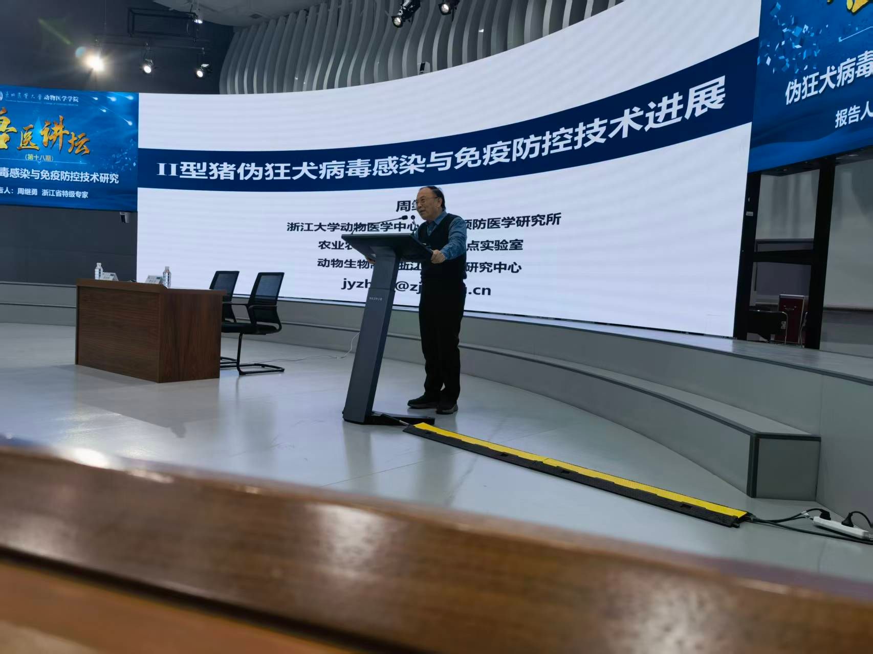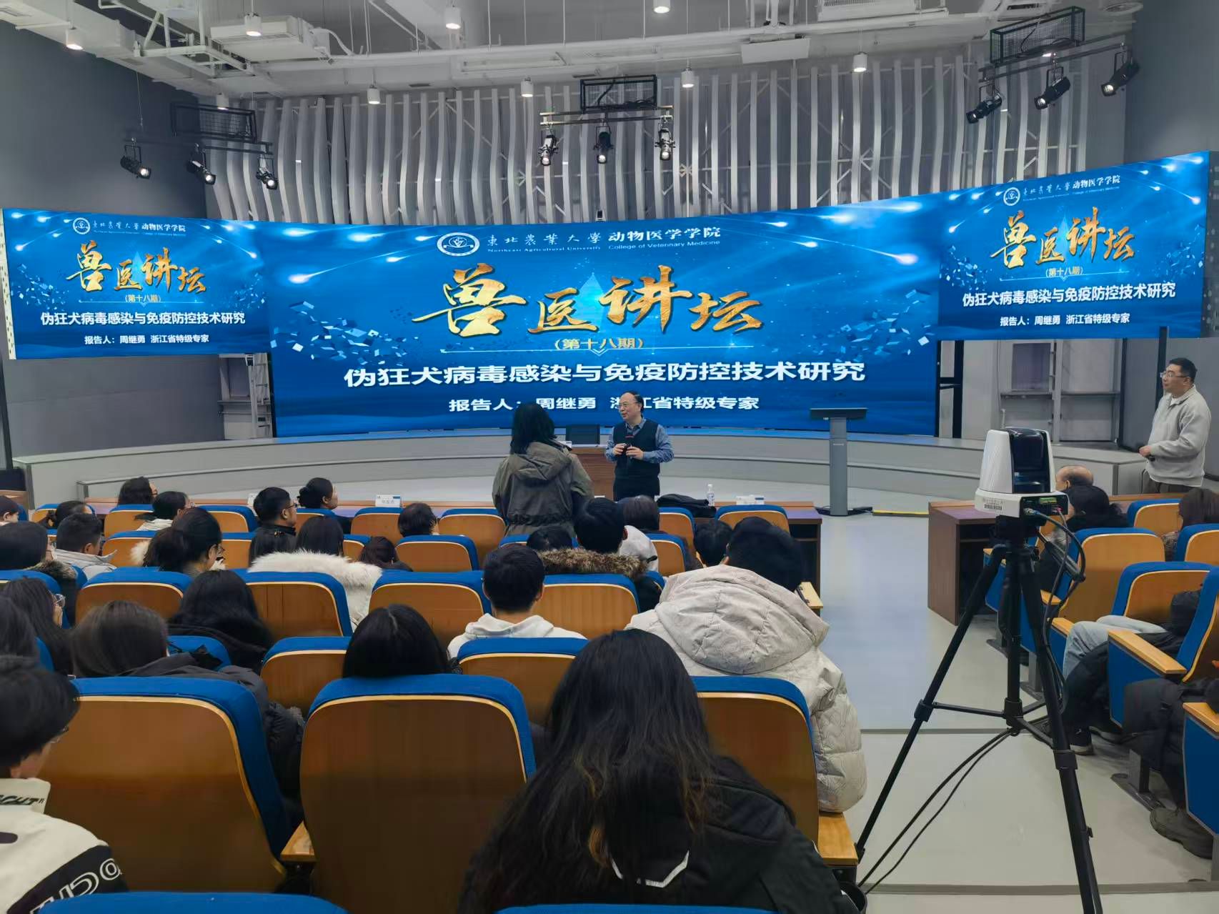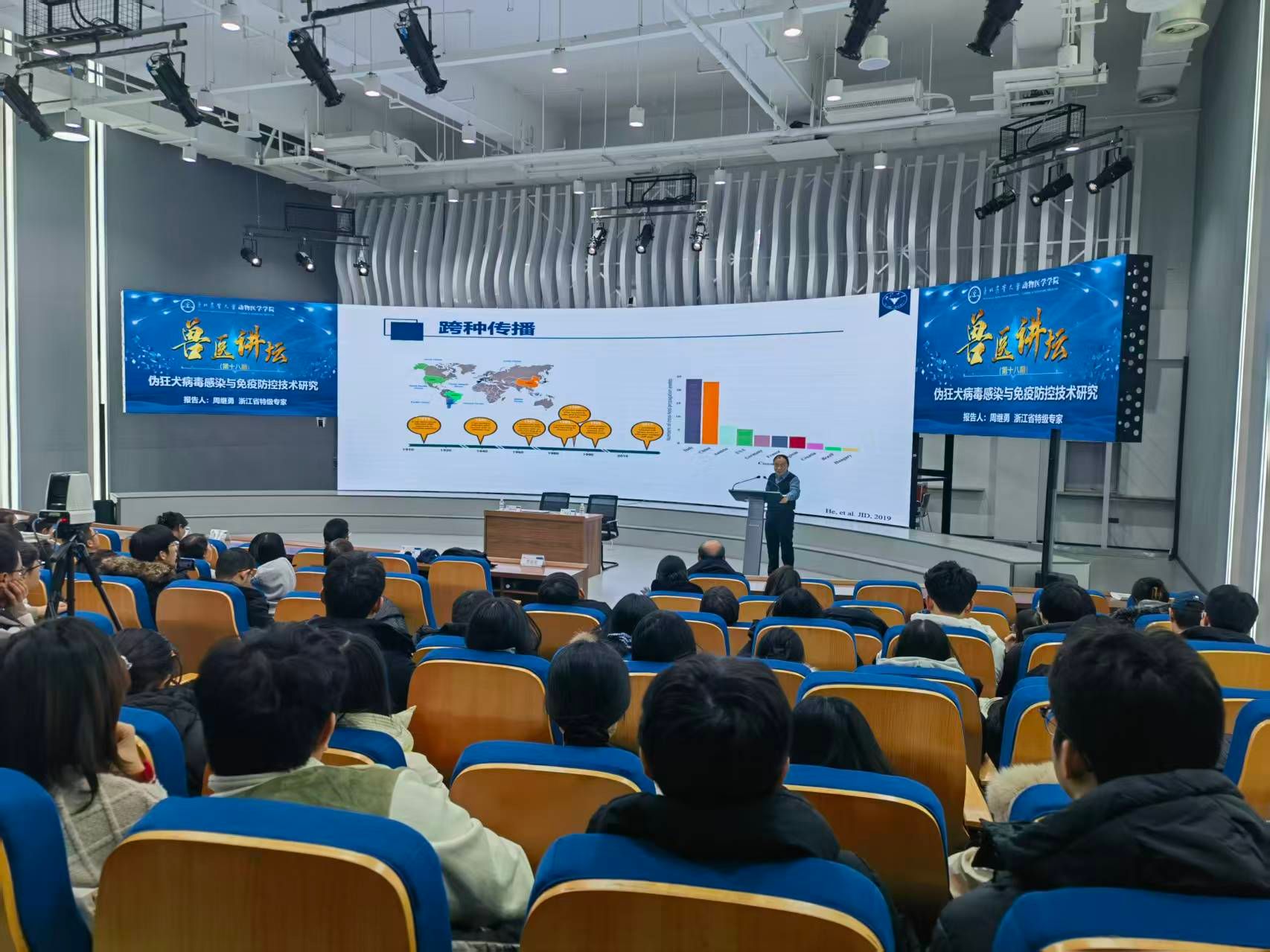 冬韵渐浓,学术飘香。12月4日下午,太阳成集团tyc41183第十八期“兽医讲坛”在成栋楼大数据与智能报告厅如期而至。本次讲坛特邀浙江省特级专家、浙江大学动物医学中心主任周继勇教授以《伪狂犬病毒感染与免疫防控技术研究》为题,带来一场兼具学术深度与实践价值的前沿分享。学院领导班子、骨干教师、研究生及本科生代表齐聚一堂,共赴这场聚焦兽医学科核心领域的学术盛宴。讲坛由学院院长李金龙教授主持。